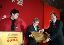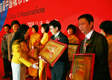 建设部科学技术委员会常务副主任、原建设部总工程师 金德钧先生;建设部干部学院副院长张庆风先生;世界(法国)著名建筑设计室德尼斯•岚明先生;北京依莲轩房地产开发有限责任公司总经理刘博女士,上台为中国城市化发展战略研究工程启动揭幕!
